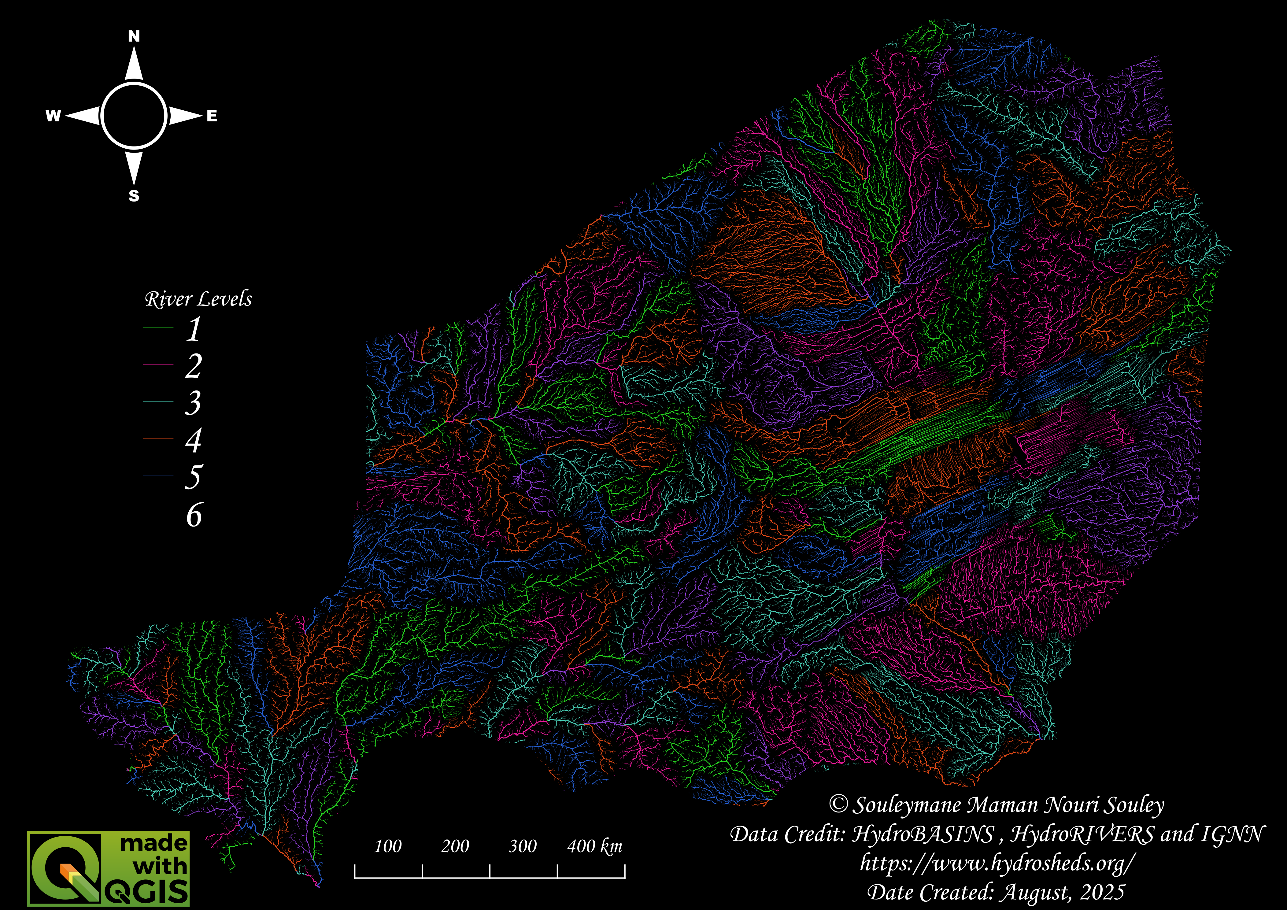 Map showing the river network hierarchy (levels 1–6) across Niger, created using QGIS with HydroBASINS and HydroRIVERS data.