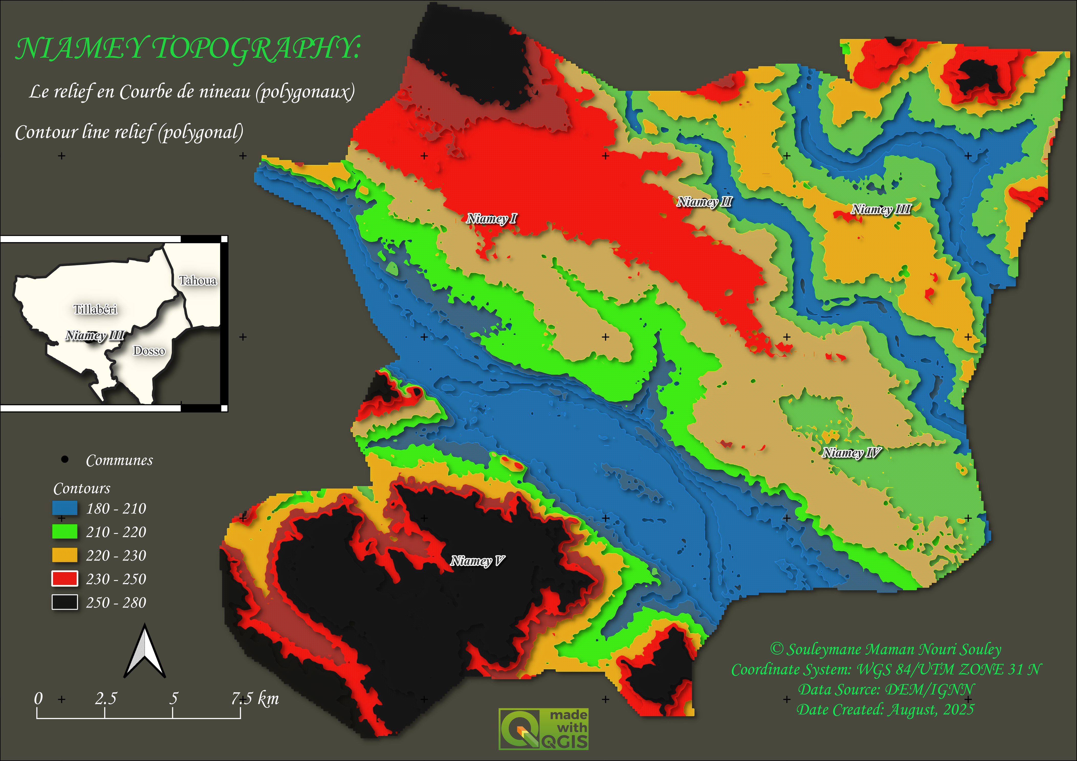 Topographic map of Niamey showing elevation variations and key landscape features.